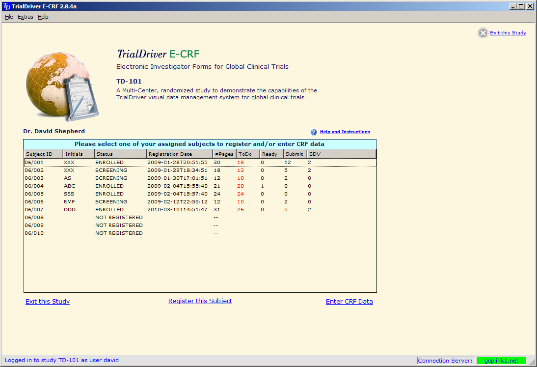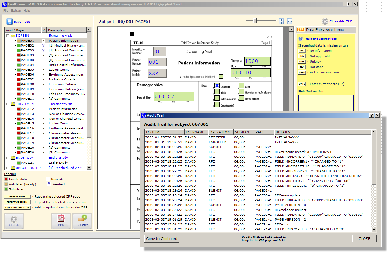 The EDC client application can also be used to display supplemental study documentation, such as, for instance, the study protocol or FDA forms. The audit trail is always available for scrutiny.