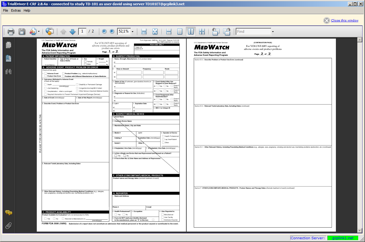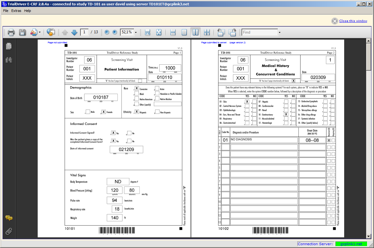 Very significantly, images of the CRF pages (either blank or populated with subject data) can be created on demand as PDF files. These can be viewed in the built-in PDF viewer and saved, printed or emailed with standard Acrobat controls.